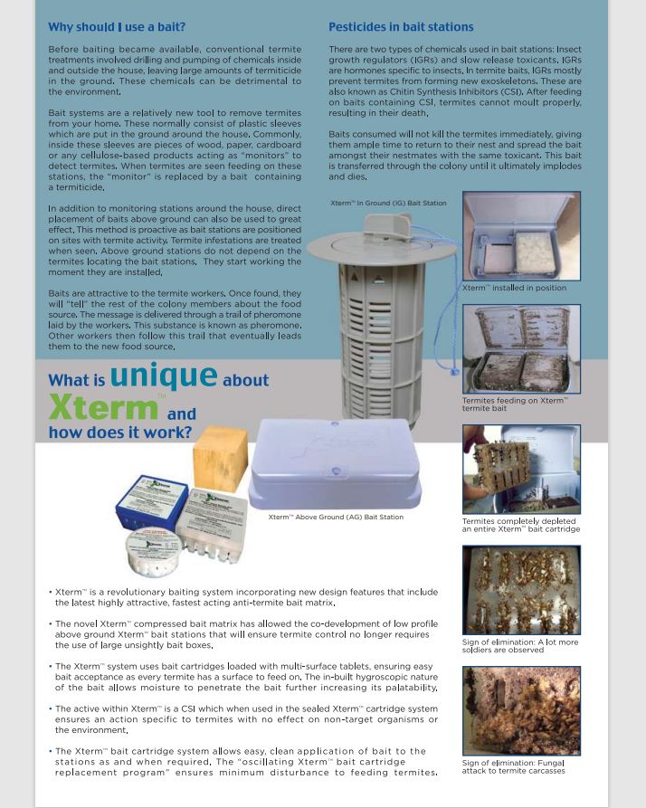 Xterm ® Termite Baiting System is the trusted non-invasive and environmentally friendly defence against termite infestations. With our termite bait solutions designed and formulated to be fast and productive, termites are baited and their colonies eliminated without drilling into a building’s structure.